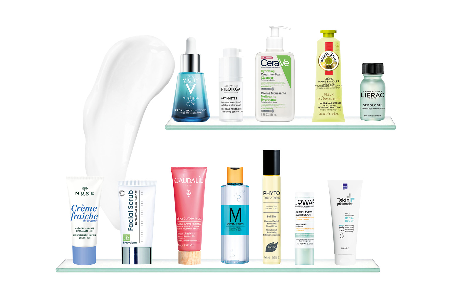 1. Booster ανάπλασης και επανόρθωσης, Mineral 89 Probiotic Fractions, Vichy 2. Κρέμα για το περίγραμμα των ματιών, Optim Eyes Intensive Revitalizing 3-in-1 Eye Contour Cream, Filorga 3. Αφρώδης κρέμα καθαρισμού προσώπου, Cream to Foam Cleanser, CeraVe 4. Ενυδατική κρέμα για χέρια και νύχια, Fleur D’Osmanthus Hand & Nail Cream, Roger & Gallet 5. Συμπύκνωμα κατά των ατελειών, Sebologie Concentre Stop Boutons, Lierac 6. Κρέμα 48ωρης ενυδάτωσης προσώπου, Crème Fraîche de Beauté Moisturising Plumping Cream, Nuxe 7. Τζελ απολέπισης για το πρόσωπο, Facial Scrub Exfoliating Skin Purifier, Frezyderm 8. Ενυδατική μάσκα προσώπου, Vinosource Hydra Moisturizing Mask, Caudalie 9. Νερό καθαρισμού για πρόσωπο και μάτια για όλους τους τύπους δέρματος, Micellar Water for Face & Eyes, M Cosmetics 10. Συμπύκνωμα εξισορρόπησης του τριχωτού της κεφαλής, PhytoPolléine Botanical Concentrate, Phyto 11. Θρεπτικό balm για ταλαιπωρημένα ή ξηρά χείλη, Nourishing Lip Balm, Jowaé 12. Ενυδατική κρέμα σώματος, The Skin Pharmacist Hydra Boost Body Cream, InterMed