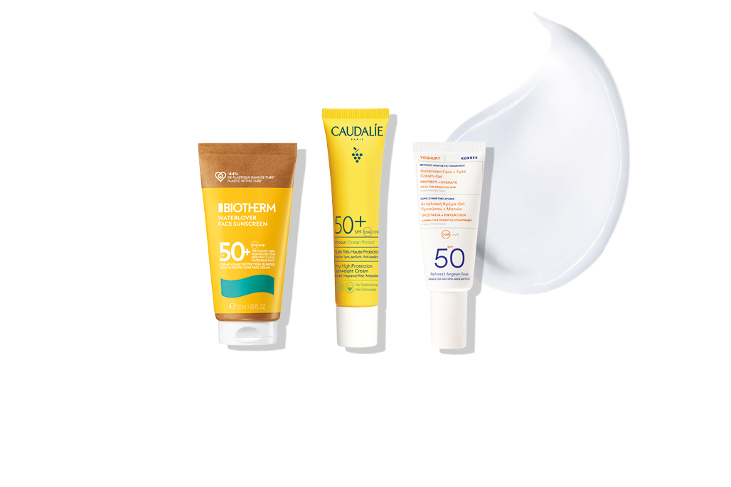 1. Aντηλιακό υψηλής προστασίας με σύνθεση φιλική προς την υδρόβια ζωή και συσκευασία από χαρτόνι, Waterlover Face Sunscreen SPF50+, Biotherm 2. Ελαφρύ αντηλιακό προσώπου με βιοδιασπώμενη φόρμουλα και συσκευασία από ανακυκλωμένο και 100% ανακυκλώσιμο πλαστικό, Vinosun Very High Protection Lightweight Cream SPF50+, Caudalie 3. Αντηλιακή κρέμα-τζελ για πρόσωπο και μάτια με σύνθεση χωρίς σιλικόνες και χωρίς φίλτρα επιβλαβή για το θαλάσσιο περιβάλλον, Yoghurt Sunscreen Face+Eyes Cream-Gel SPF50, Korres