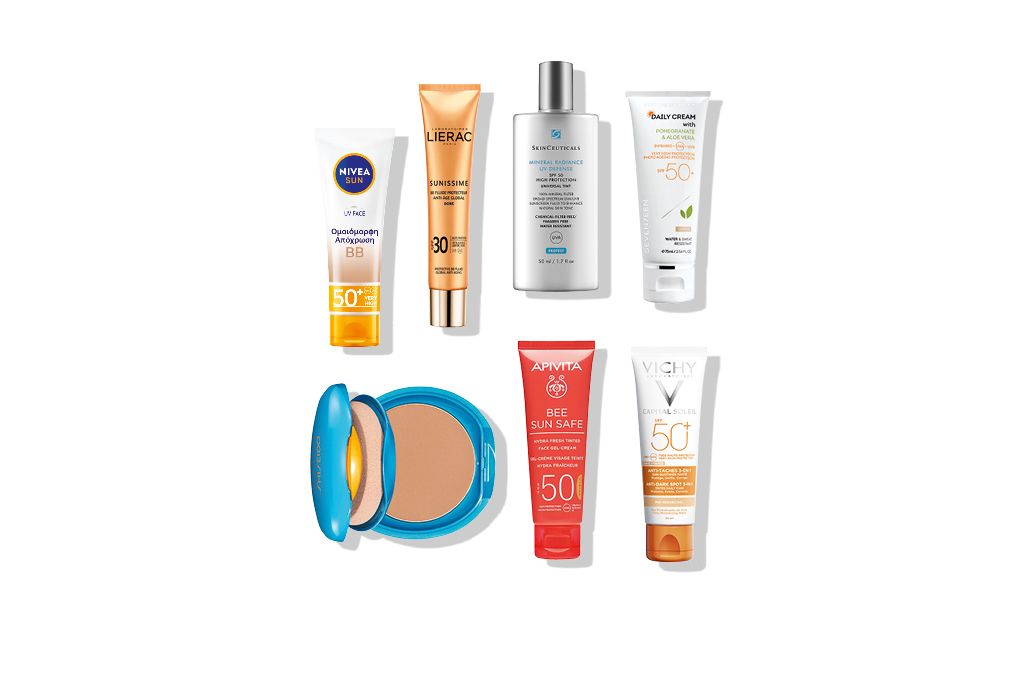 1. Aντηλιακή κρέμα με χρώμα που χαρίζει ομοιόμορφο τόνο στην επιδερμίδα, UV BB Lotion SPF 50+, Nivea Sun 2. Λεπτόρρευστη κρέμα προστασίας με χρώμα και ολικής αντιγήρανσης, BB Fluide Protecteur Anti-Age Global SPF30, Lierac 3. Αντηλιακή προστασία με φυσικά φίλτρα και χρώμα κατάλληλο για κάθε τύπο δέρματος, Mineral Radiance UV Defense SPF50, Skinceuticals 4. Αντηλιακή κρέμα με ελαφρύ χρώμα, εμπλουτισμένη με εκχυλίσματα ροδιού και αλόης, Daily Cream Very High Protection SPF50, Seventeen 5. Make up µε αντηλιακή προστασία σε µορφή πούδρας, UV Protective Compact Foundation SPF30, Shiseido 6. Ενυδατικό αντηλιακό προσώπου με χρώμα και υφή τζελ-κρέμα, Bee Sun Safe Tinted SPF50, Apivita 7. Aντηλιακό ευρέος φάσματος με χρώμα για δράση κατά των δυσχρωμιών και πρόληψη της επανεμφάνισής τους, Capital Soleil Anti-Dark Spot 3IN1 SPF50+, Vichy
