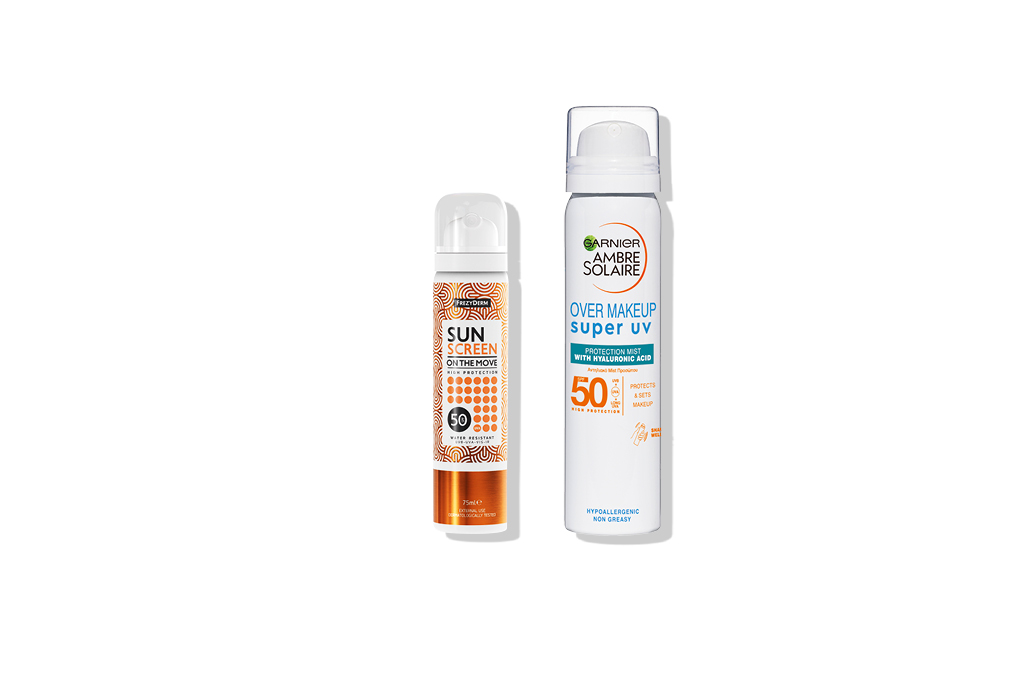 1. Aνάλαφρο αντηλιακό προσώπου σε μορφή mist που ψεκάζεται πανεύκολα χωρίς να χρειάζεται επάλειψη ακόμα και πάνω από το μακιγιάζ, Sunscreen On the Move SPF50, Frezyderm 2. Aντηλιακό σπρέι προσώπου που εφαρμόζεται ακόμα και πάνω από το μακιγιάζ. Ambre Solaire Over Makeup Super UV SPF50, Garnier