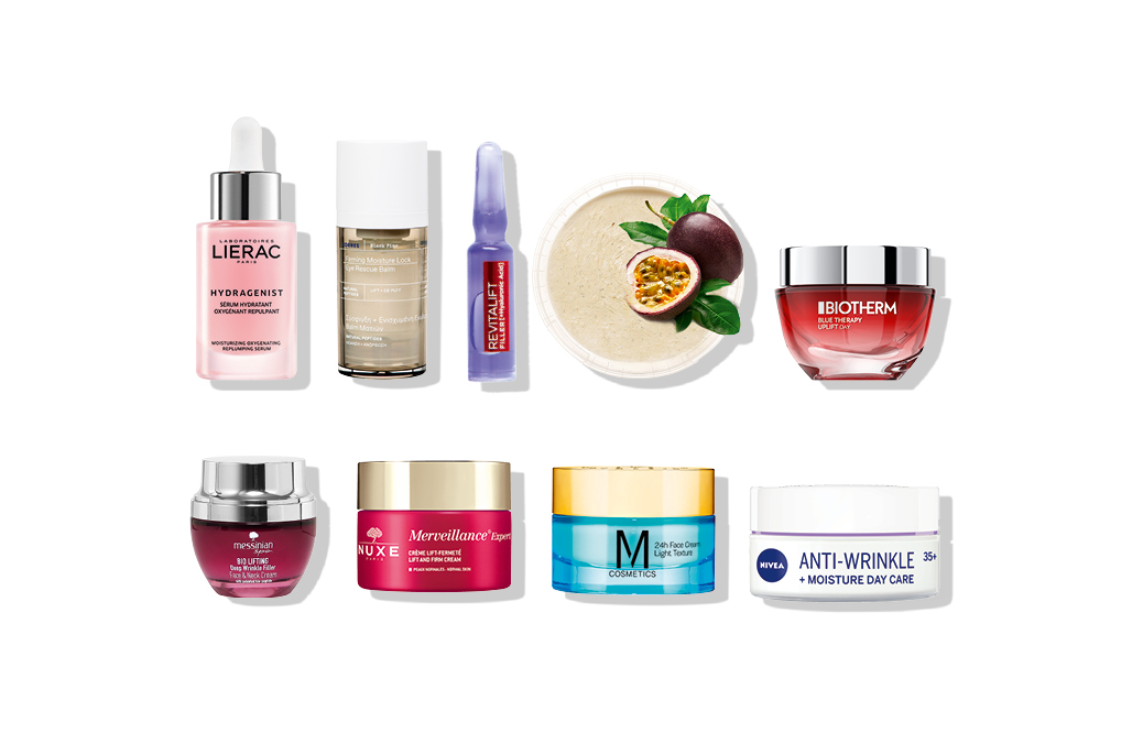 1. Ορός ενυδάτωσης με ΑΗΑ για μείωση των λεπτών γραμμών Moisturizing Oxygenating Replumping Serum, Lierac 2. Balm ματιών για σύσφιξη και ενισχυμένη ενυδάτωση, Μαύρη Πεύκη Eye Rescue Balm, Korres 3. Αμπούλες με καθαρό υαλουρονικό οξύ και βιταμίνη Β5 για ενυδάτωση, Revitalift Filler Ampoules, L’Oreal Paris 4. Μάσκα λάμψης με 5 οξέα φρούτων ΑΗΑ για την ενίσχυση της κυτταρικής ανανέωσης, Fresh Line 5. Κρέμα ημέρας με κλάσμα πεπτιδίων κολλαγόνου που ενισχύει την παραγωγή του φυσικού κολλαγόνου Blue Therapy Red Algae Day Cream, Biotherm 6. Κρέμα με βιοπεπτίδια Bio-lifting Deep Wrinkle Filler Face & Neck Cream, Messinian Spa 7. Αντιρυτιδική κρέμα που στοχεύει στις τρεις δομικές πρωτεΐνες της σύσφιξης Merveillance Expert Lift and Firm Cream, Nuxe 8. 24ωρη κρέμα με βιομιμητικά πεπτίδια 24h Face Cream Light Texture, M Cosmetics 9. Κρέμα ημέρας με βιταμίνη Ε για την ηλικία 35+ Anti-Wrinkle & Moisture Day Care 35+, Nivea