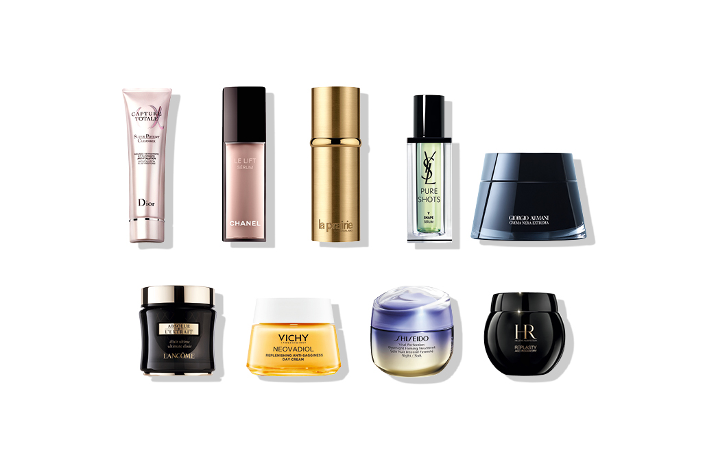1. Κρεμώδης αφρός για απαλό αλλά αποτελεσματικό καθαρισμό Capture Totale Cleanser, Dior 2. Ορός σύσφιξης με βοτανικό συμπύκνωμα alfalfa Le Lift Soothing and Firming Serum, Chanel 3. Ορός λάμψης & αναζωογόνησης με μόρια χρυσού Pure Gold Radiance Concentrate, La Prairie 4. Ορός που σμιλεύει το πρόσωπο σε σχήμα Υ Pure Shots Y Shape Serum, Yves Saint Laurent 5. Κρέμα αναζωογόνησης με σπάνια φυτικά συστατικά Crema Nera Extrema, Armani Beauty 6. Ελιξήριο αντιγήρανσης Absolue L’Extrait Ultimate Elixir, Lancôme 7. Κρέμα ημέρας που δρα ενάντια στη χαλάρωση του προσώπου μετά την εμμηνόπαυση Neovadiol Post Menopause Replenishing Anti-Sagginess Day Cream, Vichy 8. Πλούσια αντιρυτιδική κρέμα νύχτας Vital Perfection Overnight Firming Treatment, Shiseido 9. Κρέμα νύχτας με δράση επανόρθωσης Re-Plasty Age Recovery Night Cream, Helena Rubinstein