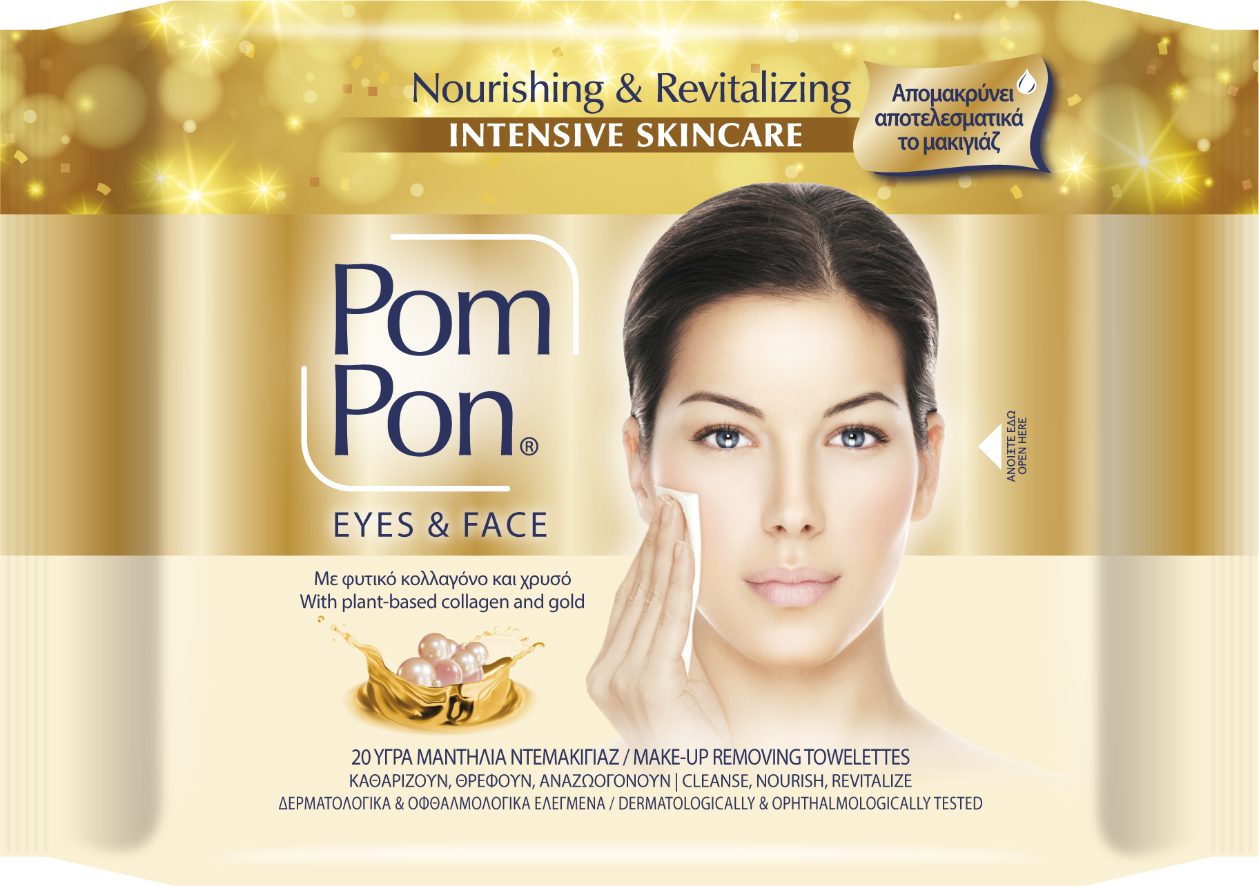 Χρυσός: Πολύτιμο συστατικό για την επιδερμίδα, αφού εξασφαλίζει πολλαπλά οφέλη: ενυδάτωση, σύσφιξη, μείωση των λεπτών γραμμών και ρυτίδων, ενώ συμβάλλει στην προστασία της επιδερμίδας από τις ελεύθερες ρίζες. Έτσι, χάρη στη μοναδικά πλούσια σύνθεσή τους, τα νέα υγρά μαντήλια ντεμακιγιάζ Pom Pon Intensive Skincare απομακρύνουν αποτελεσματικά, με μία μόνο κίνηση, σκόνη και μακιγιάζ από το πρόσωπο και τον λαιμό, αφήνοντας μία βελούδινη αίσθηση. Ενυδατώνουν, αναζωογονούν και θρέφουν την επιδερμίδα, χαρίζοντάς της νεανική λάμψη. Προσφέρουν εντατική φροντίδα σε ώριμες επιδερμίδες, καθώς και σε δέρματα που έχουν ανάγκη από εντατική ενυδάτωση και θρέψη. ∆ημιουργούν μία νότα φυσικής πολυτέλειας στο καθημερινό ντεμακιγιάζ.