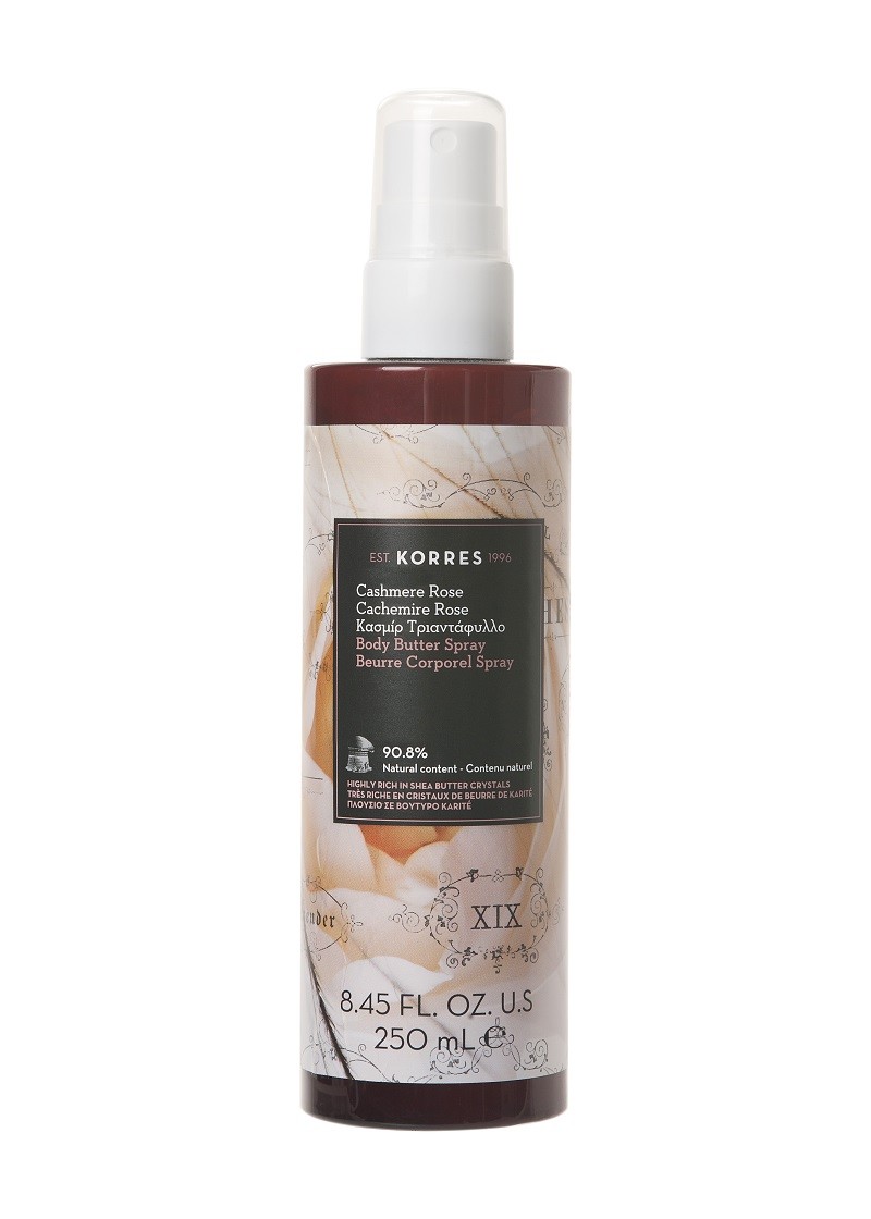 Αυτό το Body Butter σε μορφή spray είναι ιδανικό για εσάς που επιθυμείτε θρέψη και 24ωρη εντατική ενυδάτωση, βελτίωση της όψης και της ελαστικότητας της επιδερμίδας σας. Η εξαιρετικά ελαφριά, μη-λιπαρή υφή απορροφάται πραγματικά σε δευτερόλεπτα – μοναδικό χαρακτηριστικό για ένα body butter που διατηρεί, παράλληλα, την ισχυρή θρεπτική δράση του, για πιο απαλό, λείο, όμορφο δέρμα από την πρώτη εφαρμογή. Χάρη στους ενυδατικούς κρυστάλλους shea butter και τους φυσικούς πολυσακχαρίτες που προστατεύουν και ενισχύουν την ελαστικότητα του δέρματος, στο αντιοξειδωτικό και θρεπτικό κερί ελιάς και στην water-binding προβιταμίνη Β5, το νέο Body Butter Spray αφήνει το δέρμα super βελούδινο να αναδύει άλλοτε νότες τριαντάφυλλου και εξωτικής καρύδας και άλλοτε γλυκιάς βανίλιας και λεβάντας.
