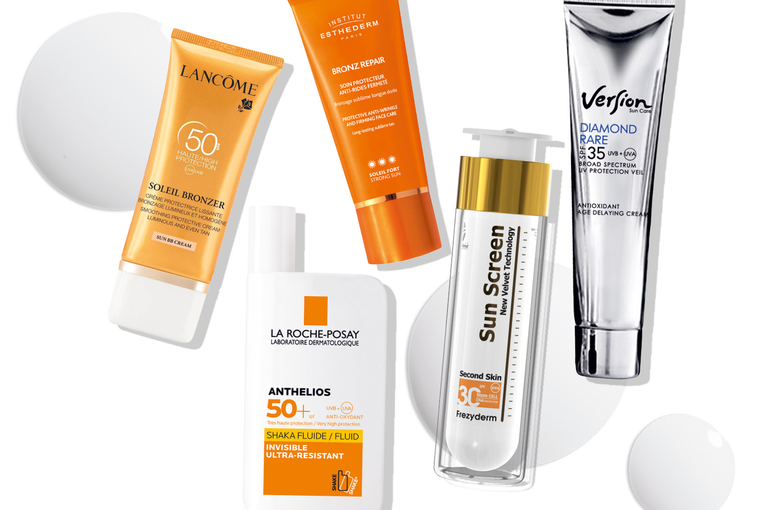 1. Aντηλιακό προσώπου για λαμπερό και ασφαλές μαύρισμα, Soleil Bronzer Smoothing Protective Cream Luminous and Even Tan SPF 50, Lancôme 2. Αντηλιακή κρέμα προσώπου με λεπτόρρευστη υφή, Anthelios Invisible Fluid SPF 50+, La Roche-Posay 3. Αντηλιακή προστασία με αντιγηραντική δράση, Bronz Repair Strong Sun, Institut Esthederm 4. Αντηλιακό με βελούδινη υφή, Sun Screen Second Skin SPF 30, Frezyderm 5. Αντηλιακή κρέμα προσώπου με αντιγηραντική δράση, Diamond Rare SPF 35 UV Protection Veil, Version