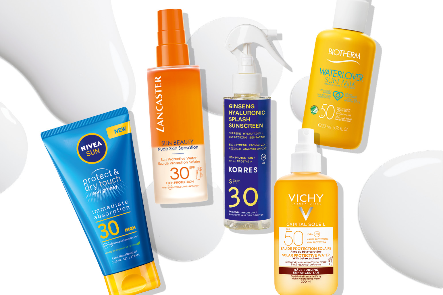 1. Αντηλιακό διφασικό νερό, Sun Beauty Nude Skin Sensation SPF 30, Lancaster 2. Αντηλιακό σπρέι για προστασία, ενισχυμένη ενυδάτωση και δροσιά, Ginseng Hyaluronic Splash Sunscreen SPF 30, Korres 3. Aντηλιακό νερό σε σπρέι για ασφαλές μαύρισμα, Capital Soleil Solar Protective Water Enhanced Tan SPF 50, Vichy 4. Aντηλιακό γαλάκτωμα για προστασία και άμεση απορρόφηση, Protect & Dry Touch SPF 30, Nivea Sun 5. Αντηλιακό σώματος με σύνθεση και συσκευασία που σέβεται το περιβάλλον, Waterlover Sun Milk SPF 50, Biotherm