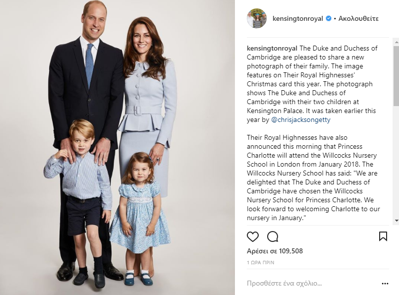 Στη λεζάντα της φωτογραφίας έγραψαν: The Duke and Duchess of Cambridge are pleased to share a new photograph of their family. The image features on Their Royal Highnesses’ Christmas card this year. The photograph shows The Duke and Duchess of Cambridge with their two children at Kensington Palace. It was taken earlier this year by @chrisjacksongetty
