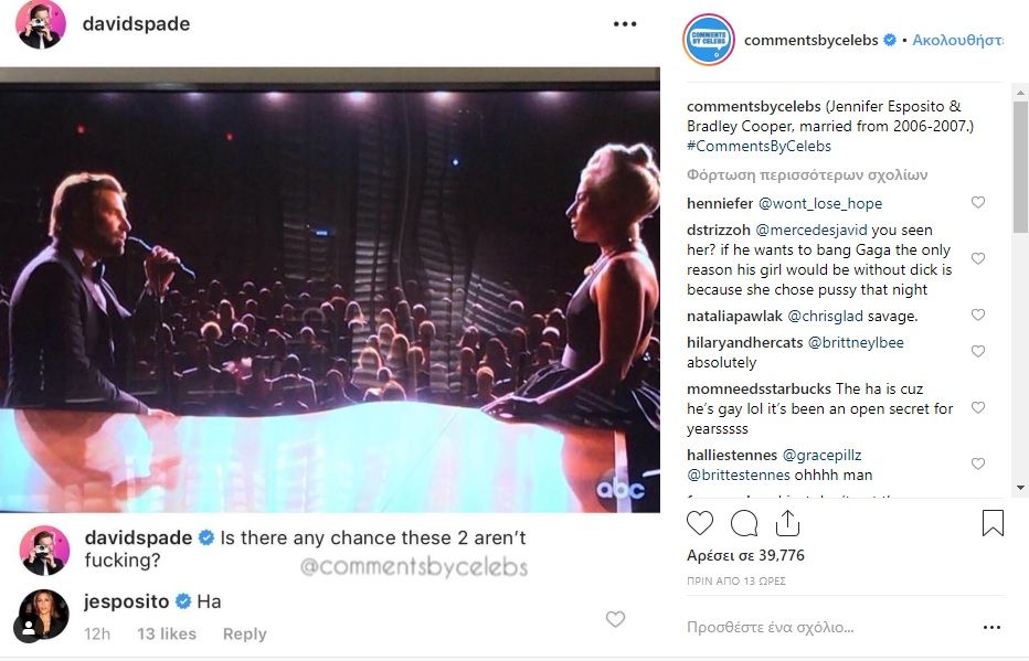 Το βράδυ της Δευτέρας, ο αμερικανός ηθοποιός David Spade δημοσίευσε ένα στιγμιότυπο οθόνης από την ερμηνεία του Cooper και της Gaga στα Oscar και ρώτησε τους followers: “Υπάρχει κάποια πιθανότητα αυτοί οι δυο να μην έχουν κάνει σεξ;”