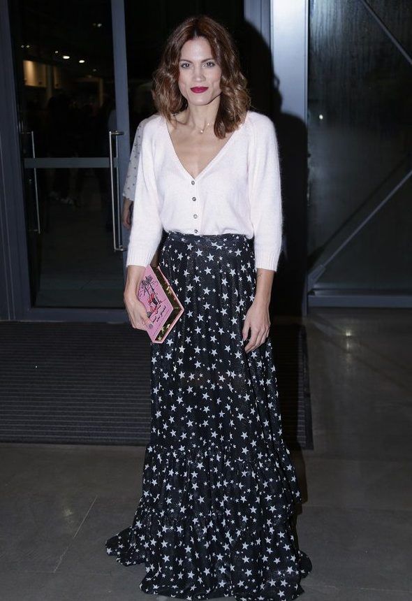Η Mairiboo επέλεξε μια μάξι μαύρη φούστα με λευκά αστέρια, λευκό top και κράτησε το ροζ embroidered clutch της σχεδιάστριας Olympia Le-Tan το οποίο κοστίζει 600 ευρώ και απεικονίζει τους ήρωες του παραμυθιού Hansel und Gretel.