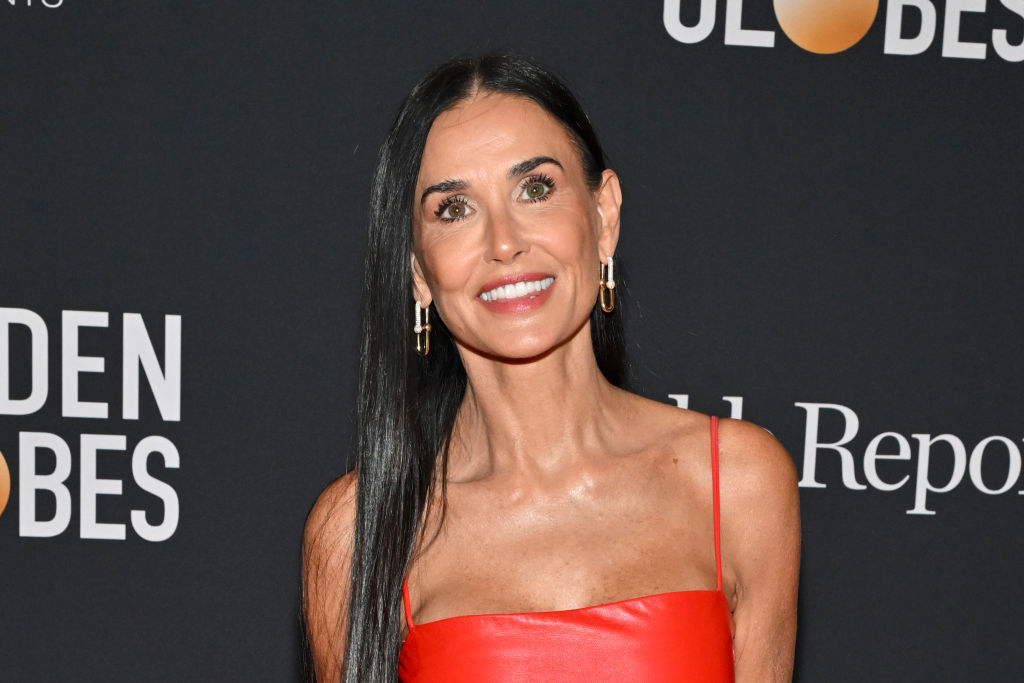 Η Moore εγκατέλειψε τα σακάκια και τα παντελόνια της για το φλογερό μονόχρωμο look, καθώς παρευρέθηκε στο πάρτι Road to the Golden Globes το Σαββατοκύριακο. Το κόκκινο δερμάτινο μίντι φόρεμα, το οποίο αναδείκνυε το μαυρισμένο ντεκολτέ της ηθοποιού με τις λεπτές τιράντες και την τετράγωνη λαιμόκοψη, αγκάλιαζε το σώμα της με ένα εφαρμοστό μπούστο και drop waist.