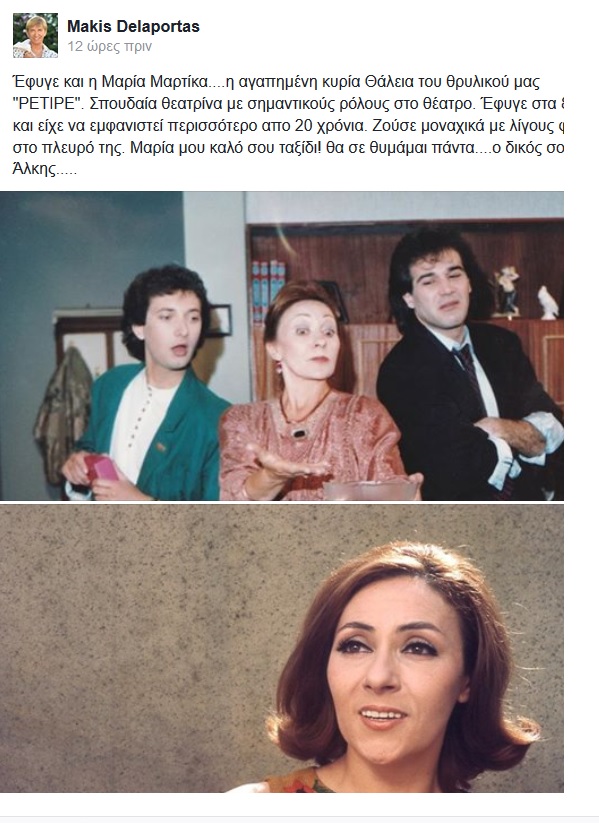 «Έφυγε και η Μαρία Μαρτίκα η αγαπημένη κυρία Θάλεια του θρυλικού μας “ΡΕΤΙΡΕ”. Σπουδαία θεατρίνα με σημαντικούς ρόλους στο θέατρο. Έφυγε στα 86 της χρόνια και είχε να εμφανιστεί περισσότερο από 20 χρόνια. Ζούσε μοναχικά με λίγους φίλους στο πλευρό της. Μαρία μου καλό σου ταξίδι! θα σε θυμάμαι πάντα ο δικός σου Άλκης», έγραψε.