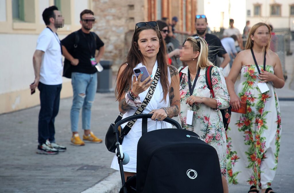 Στις φωτογραφίες που κυκλοφόρησαν από το κέντρο της Αθήνας, τη βλέπουμε με το καρότσι να περπατά και να μιλά στο κινητό τηλέφωνο.
