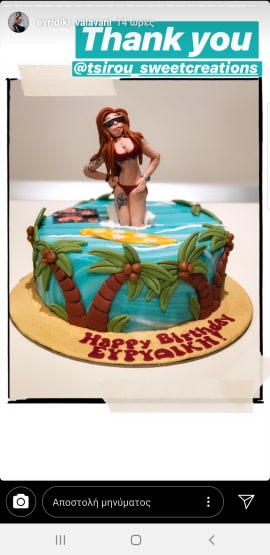 Η Ευρυδίκη Βαλαβάνη είχε χθες τα γενέθλιά της και έκλεισε τα 32 της χρόνια. Η αθλητικογράφος γιόρτασε στο σπίτι της παρακολουθώντας τον ημιτελικό της Eurovision μαζί με το σύντροφό της Κωνσταντίνο Βασάλο και την παρέα της. Εντυπωσιακή ήταν η τούρτα της, η οποία απεικόνιζε την ίδια σε ένα μικρό ομοίωμά της από ζαχαρόπαστα. Όπως η ίδια έγραψε στο Instagram της η τούρτα ήταν έκπληξη του Κωνσταντίνου και αισθάνεται πολύ ευλογημένη για όλα όσα έχει στη ζωή της. Χρόνια σου πολλά Ευρυδίκη!