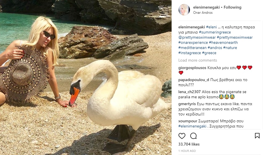 Το πρώτο Σαββατοκύριακο του καλοκαιριού 2018 η Ελένη πήγε για μπάνιο παρέα με έναν πανέμορφο κύκνο και ανέβασε το στιγμιότυπο στο Instagram: