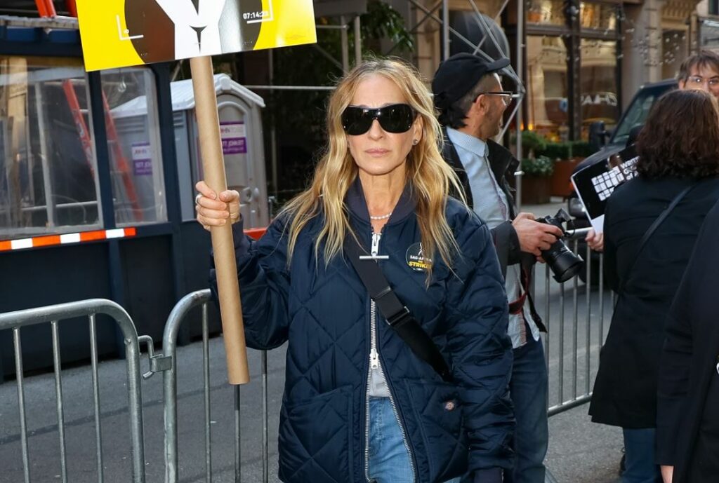 H Sarah Jessica Parker είναι μία ακόμα ηθοποιός που βγήκε στους δρόμους της Νέας Υόρκης την Τετάρτη 25 Οκτωβρίο , κρατώντας το πλακάτ με το σήμα του σωματείου και φορώντας την κονκάρδα του πάνω στο μπουφάν της. Η πρωταγωνίστρια του And Just Like That… περπάτησε μαζί με συναδέλφους της όπως ο John Slattery και η Rebecca Damon και φώναξε συνθήματα υπέρ της απεργίας. Η διάσημη σταρ φόρεσε ένα τζιν παντελόνι, μία γκρι φούστα, ένα καπιτονέ μπλε μπουφάν και ένα ζευγάρι ανοιχτά γκρι μποτάκια.