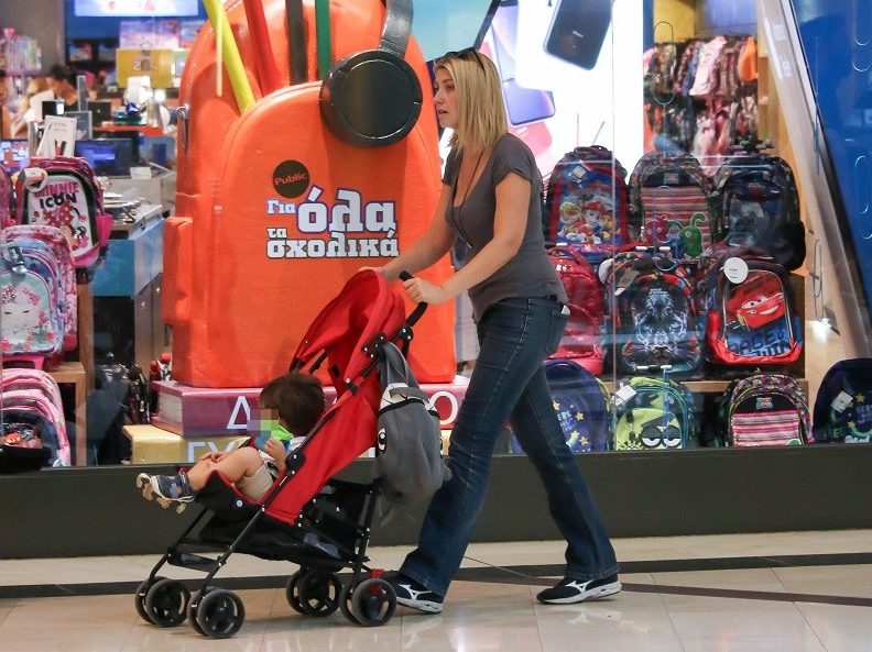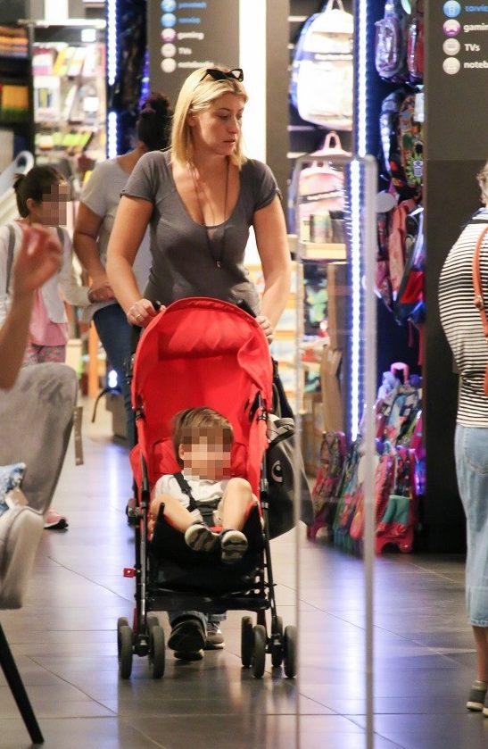 Αυτή τη φορά ο φωτογραφικός φακός την εντόπισε μαζί με το γιο της Δημοσθένη να τον κάνει βόλτα με το καρότσι του σε μεγάλο εμπορικό κέντρο της Αθήνας και μας φαίνεται πως όταν δε βάφεται τελικά μας αρέσει ακόμα περισσότερο, άλλωστε δεν έχει τίποτα να καλύψει. Επίσης παρατηρήσαμε ότι η σιλουέτα της είναι φανερά αδυνατισμένη.