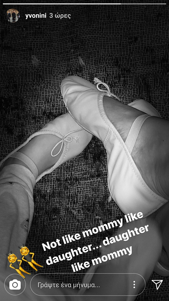 Χθες στο Insta Stories της ανέβασε μια φωτογραφία στην οποία μαμά και κόρη δείχνουν τα παπουτσάκια του μπαλέτου τους με την Υβόννη να γράφει πάνω στην εικόνα: “Not like mommy like daughter…daughter like mommy” κάνοντας ένα λογοπαίγνιο με την έκφραση “Like mother like daughter” που είναι κάτι σαν το ελληνικό “Κατά μάνα κατά κύρη κατά γιο και θυγατέρα”.