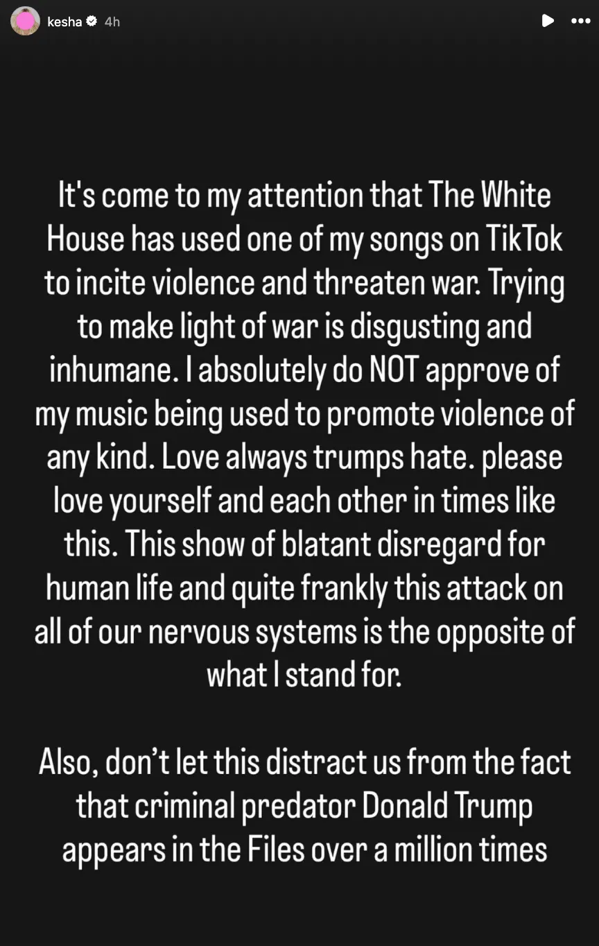 Η Kesha στρέφεται δημόσια κατά της κυβέρνησης του Donald Trump, καταγγέλλοντας τη χρήση του τραγουδιού της «Blow» σε βίντεο που δημοσιεύτηκε στους επίσημους λογαριασμούς του Λευκού Οίκου.
