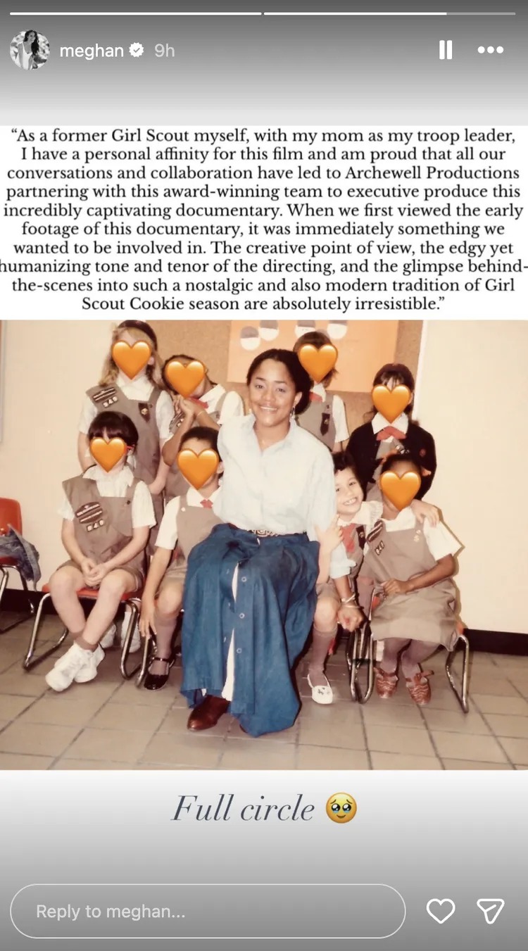 Δίπλα σε μια σπάνια φωτογραφία από τα παιδικά της χρόνια, όπου εμφανίζεται ως μικρή πρόσκοπος μαζί με τη μητέρα της, Doria Ragland, η οποία ήταν η αρχηγός της ομάδας, η Markle έγραψε «full circle». Δημοσίευσε επίσης τη δήλωσή της για το ντοκιμαντέρ: