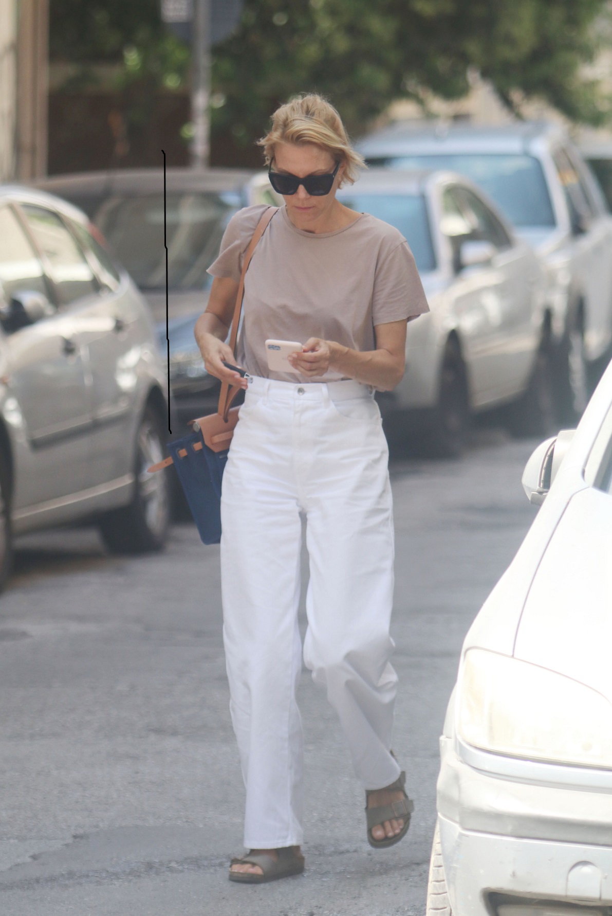 Το 42χρονο μοντέλο προτίμησε ένα λευκό wide leg παντελόνι, απλό tshirt στο χρώμα της άμμου και σανδάλια τύπου Birkenstock που έχει ξαναπροτιμήσει σε παλαιότερή της casual βόλτα.