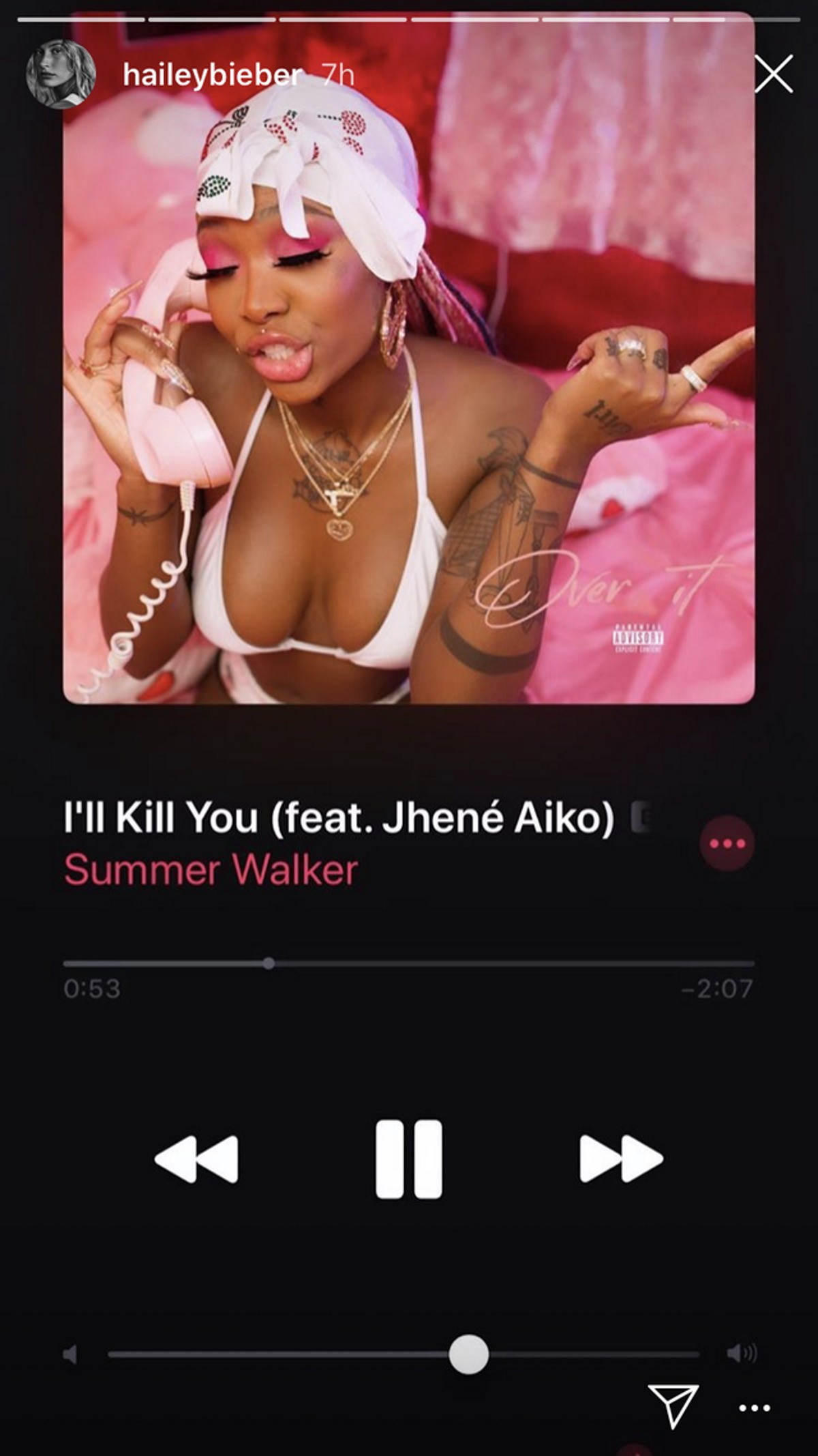 Η “απάντηση” ήρθε επίσης με τραγούδι. Ή τουλάχιστον έτσι ερμήνευσαν οι θαυμαστές της το story που έκανε η Hailey με το κομμάτι “Ι’ll kill you” της  Summer Walker. Οι στίχοι του είναι προειδοποίηση για τις άλλες γυναίκες που θέλουν να μπουν ανάμεσα σε ένα ζευγάρι.