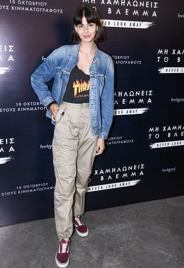 Η 14χρονη μαθήτρια που φυσιογνωμικά μοιάζει στον πατέρα της ήταν πολύ cool ντυμένη και είχε casual look με oversized denim μπουφάν, Τ shirt με logo, μπεζ παντελόνι και sneakers.
