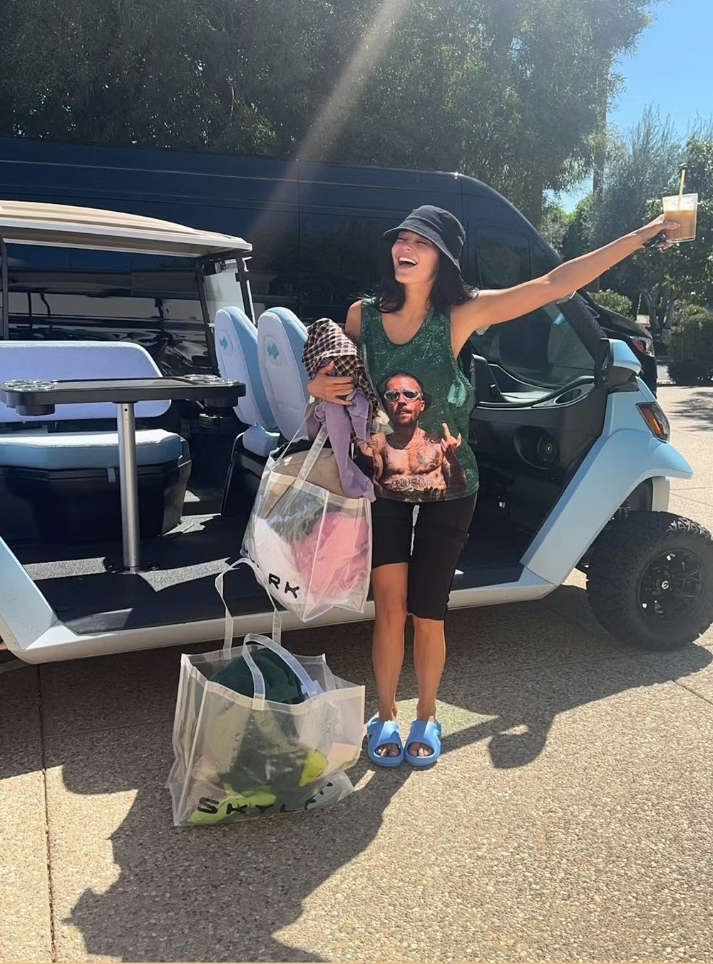 Για την πρώτη της μέρα στο φεστιβάλ, η Jenner εμφανίστηκε με ένα πράσινο tank top που είχε τυπωμένο το πρόσωπο του Justin Bieber, δημιουργώντας αμέσως viral συζήτηση στα social media, καθώς ο Bieber αποτελούσε τον βασικό performer του φεστιβάλ για φέτος. Το σύνολο ολοκληρώθηκε με μαύρο κολάν, bucket hat και γαλάζιες παντόφλες, κάνοντας το look αρκετά απλό και πολύ άνετο για την περίσταση.