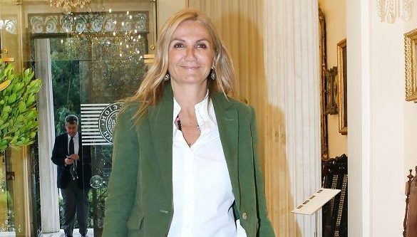Η σύζυγος του αρχηγού της αξιωματικής αντιπολίτευσης τίμησε το brand της, Ζeus & Dione, φορώντας μια τουνίκ σε χακί χρώμα και κρατώντας μια τσάντα με folklor αναφορές. Τα συνδύασε με μπεζ παντελόνι καμπάνα, ένα μιλιτέρ τζάκετ πανωφόρι και τακούνια στιλέτο. Ολοκλήρωσε το look της με γυαλιά aviator.