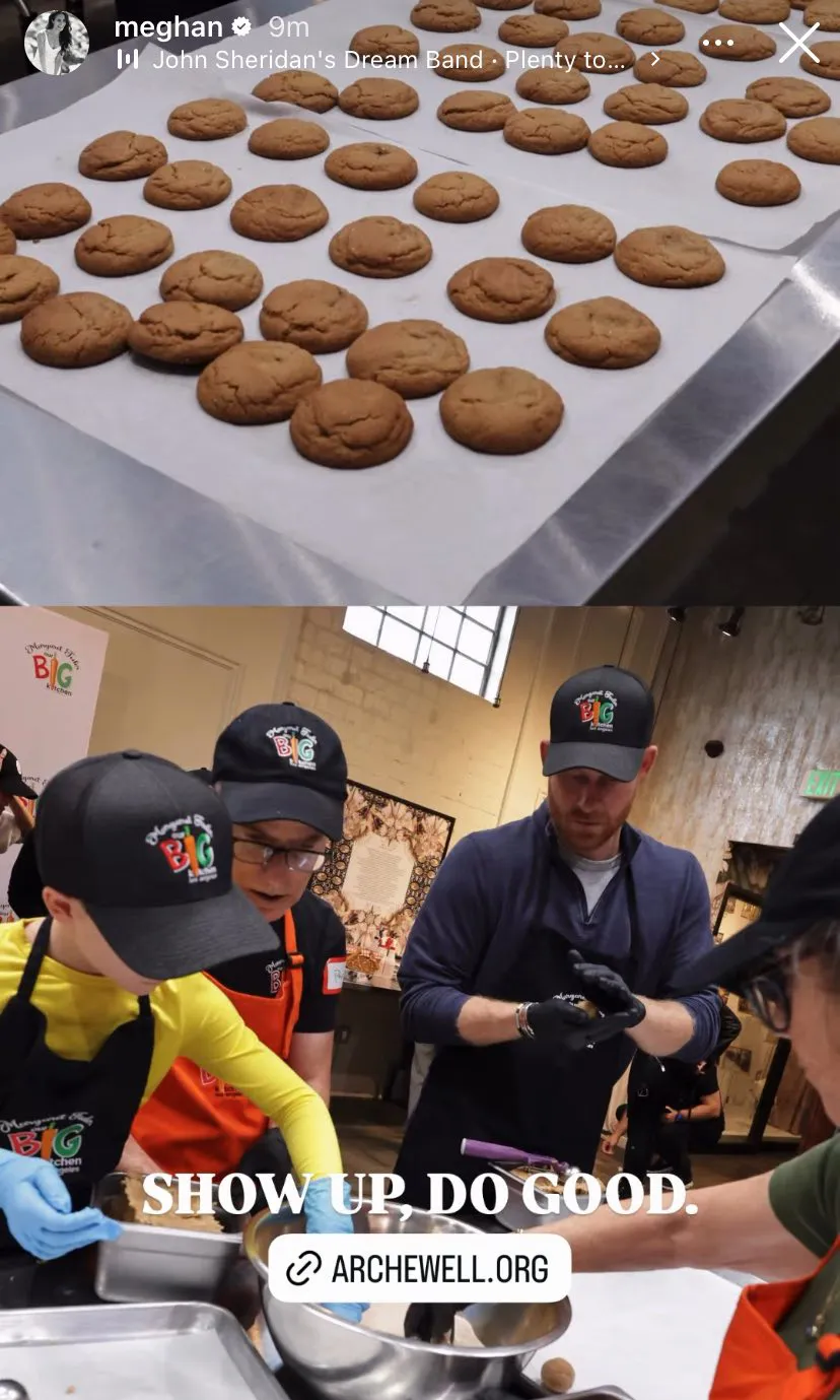 Οι φωτογραφίες από τη μέρα δείχνουν τον Archie και τη Lilibet να συμμετέχουν ενεργά στη γραμμή συσκευασίας, πλάθοντας μικρές μπάλες ζύμης δίπλα στους γονείς τους. Η Meghan ανέβασε μάλιστα το αποτέλεσμα στα Instagram Stories της, γράφοντας: «Show up, do good».
