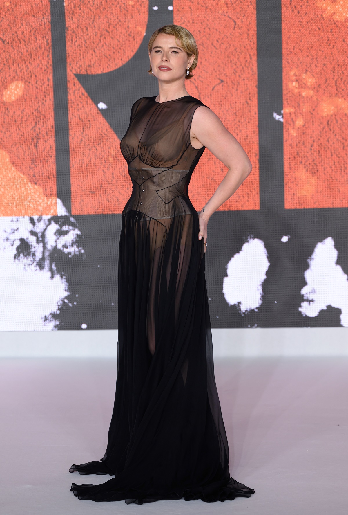 Στο καινούριο λουκ της, στο πνεύμα της κατεξοχήν γκοθ αυτής ιστορίας, ανέδειξε ένα ρετρό αξεσουάρ, έναν λευκό κορσέ, που διαφαινόταν μέσα από το μαύρο, ημιδιάφανο μάξι φόρεμά της.