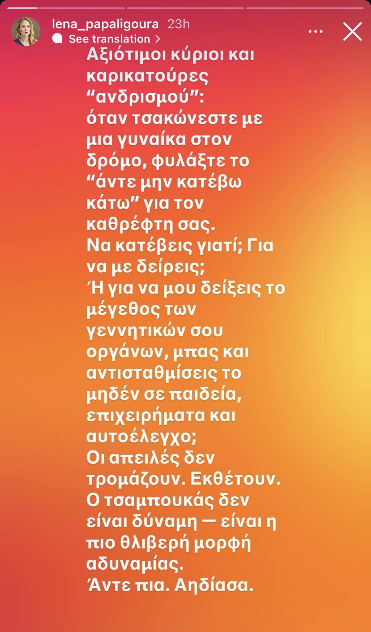 «Αξιότιμοι κύριοι και καρικατούρες του “ανδρισμού”: όταν τσακώνεστε με μια γυναίκα στον δρόμο, φυλάξτε το “άντε μην κατεβώ κάτω” για τον καθρέφτη σας. Να κατεβείς γιατί; Για να με δείρεις; Ή για να μου δείξεις το μέγεθος των γεννητικών σου οργάνων, μπας και αντισταθμίσεις το μηδέν σε παιδεία, επιχειρήματα και αυτοέλεγχο; Οι απειλές δεν τρομάζουν. Εκθέτουν. Ο τσαμπουκάς δεν είναι δύναμη – είναι η πιο θλιβερή μορφή αδυναμίας. Άντε πια. Αηδίασα».