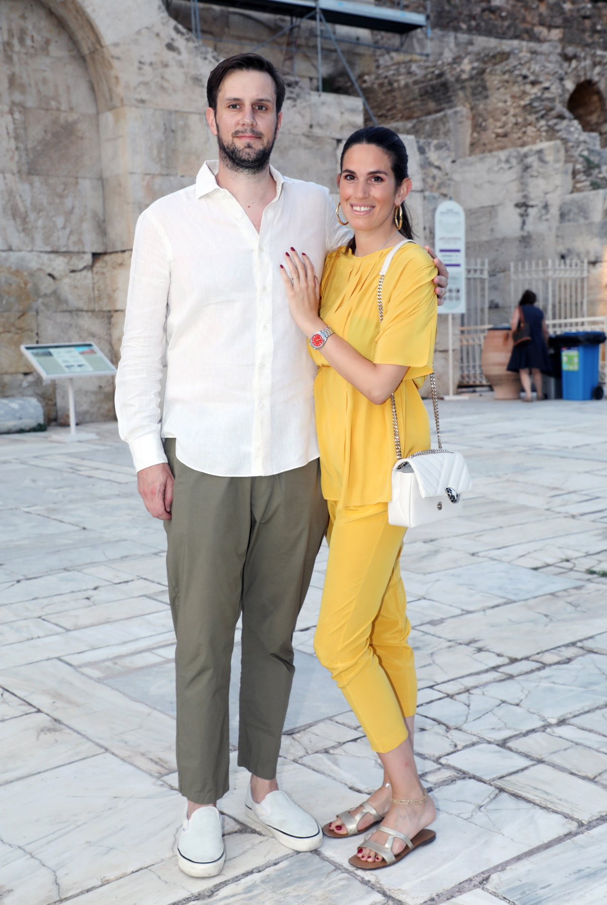 Η Αναστασία Καίσαρη πόνταρε στη μονοχρωμία αλλά στο εντυπωσιακό κίτρινο και το αποτέλεσμα μαγνητίζει το βλέμμα. Η πρωταγωνιστική απόχρωση φωτίζει και ταυτόχρονα κολακεύει την καλλίγραμμη σιλουέτα της. Το look συμπλήρωσαν αξεσουάρ σε ουδέτερους τόνους, μια λευκή βραδινή τσάντα και ένα ζευγάρι μεταλλιζέ flat πέδιλα, που συνδυάζουν την αίσθηση πολυτέλειας με την άνεση.