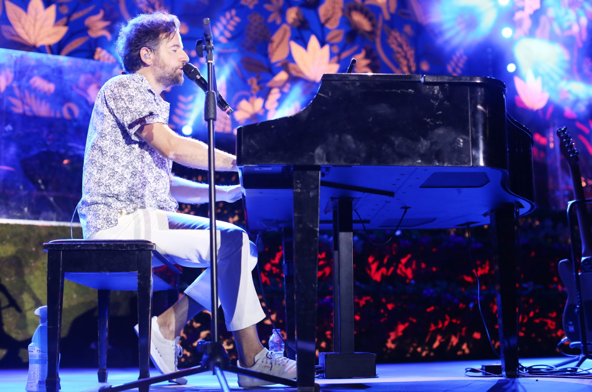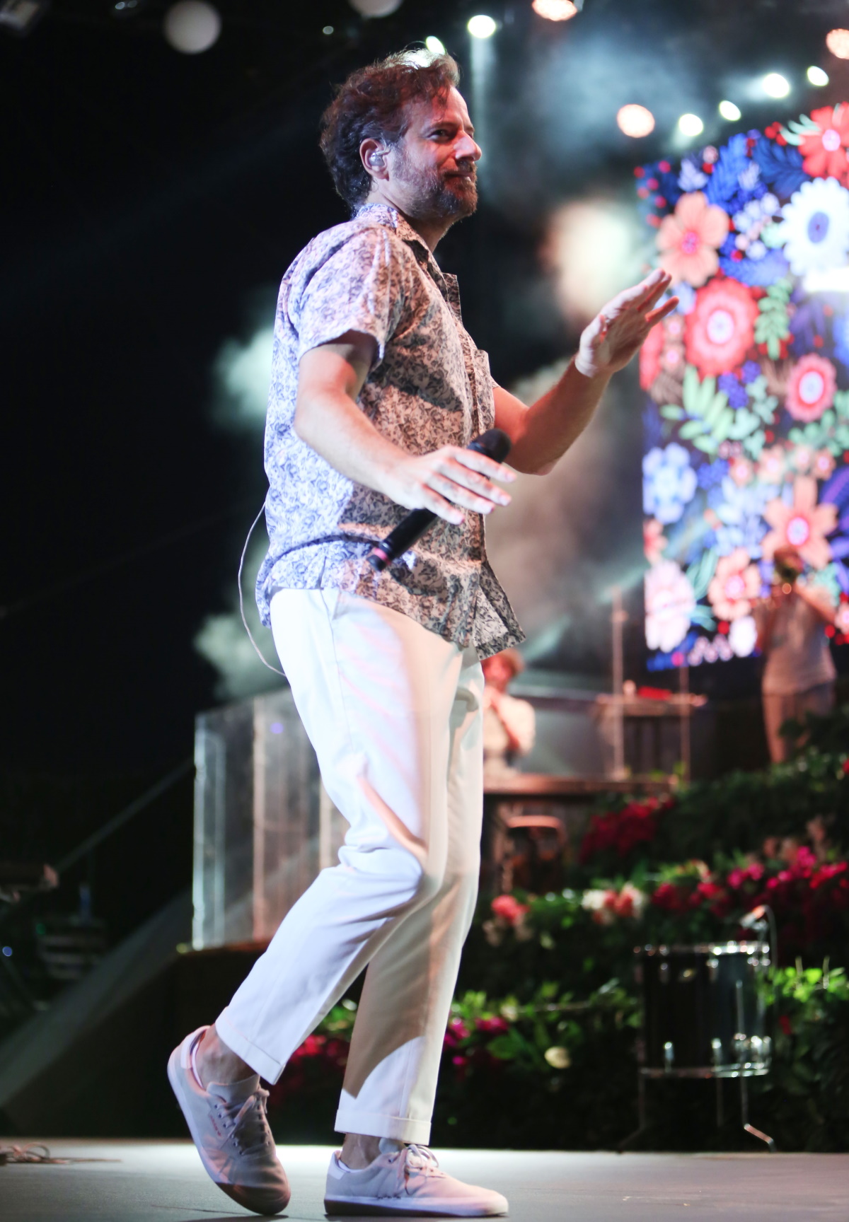 Το σύνολο της Τόνιας Σωτηροπούλου ταίριαζε απόλυτα με το λουλουδένιο backround που είχε ο τραγουδοποιός κατά τη διάρκεια του live του.