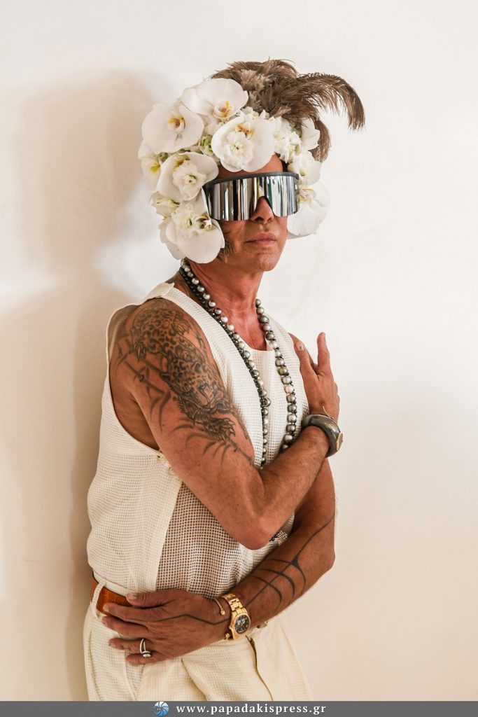 Ο κύριος Γαβαλάς, ένας από τους ελάχιστους ανθρώπους στην Ελλάδα που κατάφεραν να επιβάλλουν την εκκεντρικότητά τους με ένα μοναδικό στυλ, εμφανίστηκε στο show φορώντας ένα ultra καλοκαιρινό total white σύνολο. Τα αξεσουάρ ήταν αυτά που πραγματικά απογείωσαν το outfit του. Το εκκεντρικό head piece με τα λευκά λουλούδια και τα φτερά, το στυλάτο attitude, τα mules, τα εντυπωσιακά γυαλιά ηλίου και οι καλά μελετημένες πόζες του ήταν αυτά που τράβηξαν όλα τα φλας των φωτογράφων πάνω του. Ας μην ξεχνάμε βέβαια και το πολύχρωμο «pride» τζάκετ που φόρεσε όταν βγήκε από το πολυτελές ξενοδοχείο…