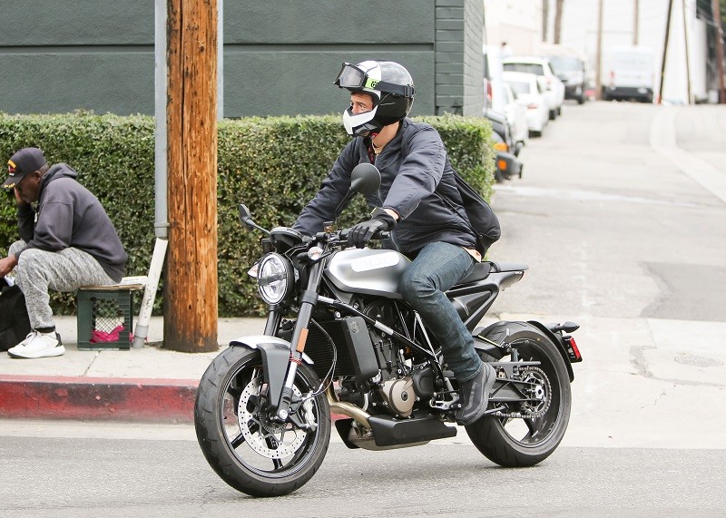 Ο ηθοποιός οδηγεί μια μηχανή μάρκας Husqvarna και δίνει το καλό παράδειγμα φορώντας κράνος.