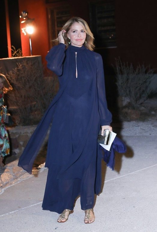 Η Τζένη Μπαλατσινού επέλεξε ένα αέρινο φόρεμα από μπλε μουσελίνα με κλειστή λαιμόκοψη, φλατ σανδάλια και ένα box clutch.
