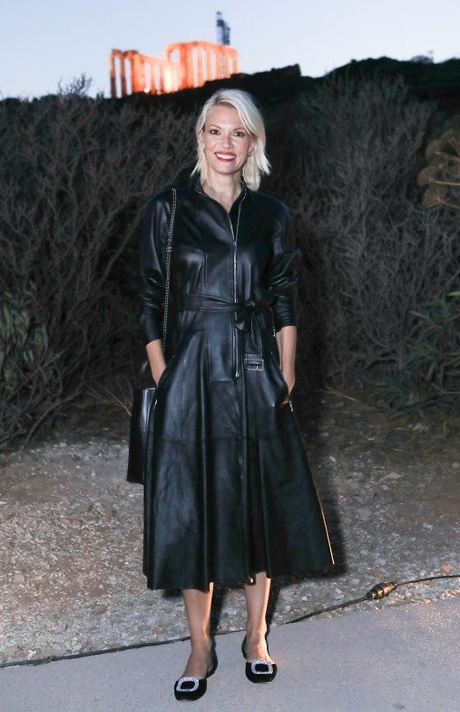 H Βίκυ Καγιά επέλεξε ένα μαύρο μίντι δερμάτινο φόρεμα, μπαλαρίνες και ολοκλήρωσε το look με επίσης μαύρη chain bag. Αποθέωση του total black.