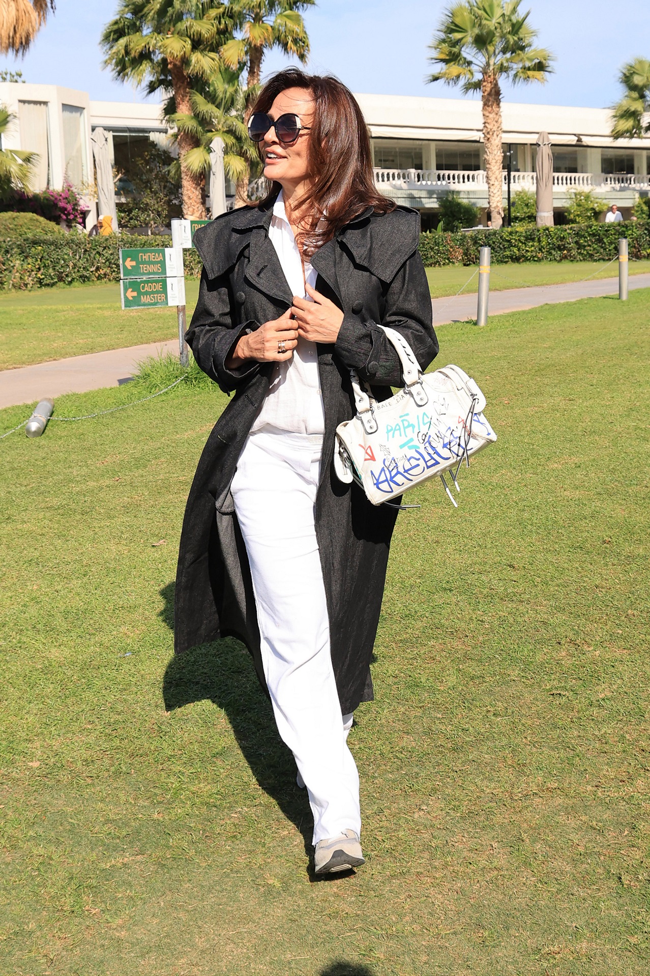 Για την ακρίβεια συνδύασε ένα λευκό, φαρδύ παντελόνι με ένα λευκό πουκάμισο και ανοιχτόχρωμα sneakers. Ολοκλήρωσε την εμφάνισή της με μακριά, μαύρη καμπαρντίνα και δερμάτινη τσάντα στις αποχρώσεις του λευκού.