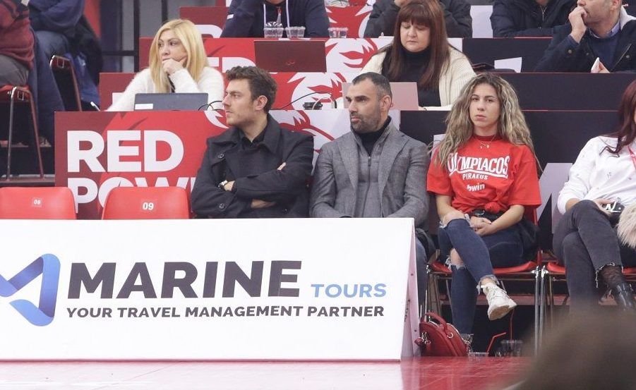 Nτυμένος casual chic με γκρι σακάκι, ασορτί γιλέκο και μαύρο ζιβάγκο συνοδευόταν από μια κοπέλα η οποία φορούσε ένα κόκκινο T Shirt του Ολυμπιακού, στοιχείο που από μόνο του δείχνει ότι είναι ένθερμη φίλαθλος της ομάδας.