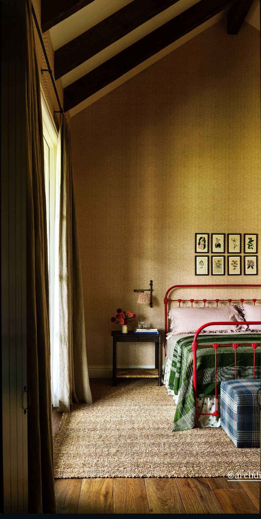 Το υπνοδωμάτιο, το οποίο η Kendall χαρακτηρίζει «ώριμο» αλλά ταυτόχρονα ικανό να την κάνει να νιώθει παιδί, θυμίζει δωμάτιο παλιού ορεινού αρχοντικού, με βαριά χαλιά, ταπετσαρία και ξύλινα ταβάνια. «Σε κάνει να θέλεις να διαβάσεις εκατομμύρια βιβλία εδώ μέσα», λέει η ίδια, περιγράφοντας τη ζεστασιά που της προξενεί ο χώρος.
