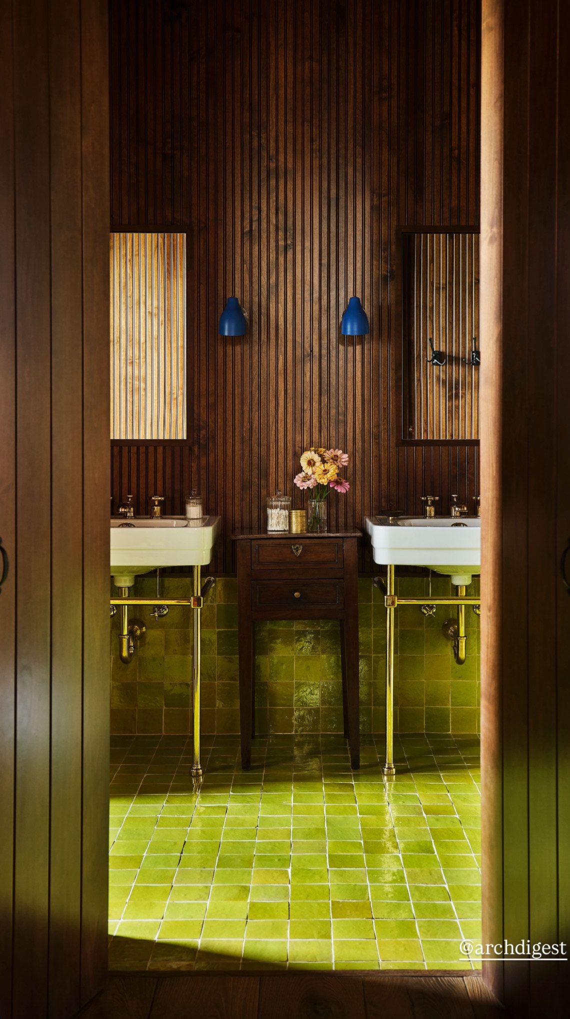 Τα αγαπημένα της δωμάτια φαίνεται πως είναι τα μπάνια -και όχι άδικα. Εκεί κυριαρχούν έντονα χρώματα: το μπορντό στα τοιχώματα και τα μάρμαρα του ντους στο δικό της μπάνιο, αλλά και η σύνθεση πράσινου μαρμάρου με ξύλο στο δεύτερο, εμπνευσμένο από την αισθητική των ’70s. Στο τρίτο μπάνιο, πλακάκια σε βαθύ μπλε συνδυάζονται με σκούρο πράσινο στους τοίχους, δημιουργώντας μια σχεδόν φαντασιακή αίσθηση.