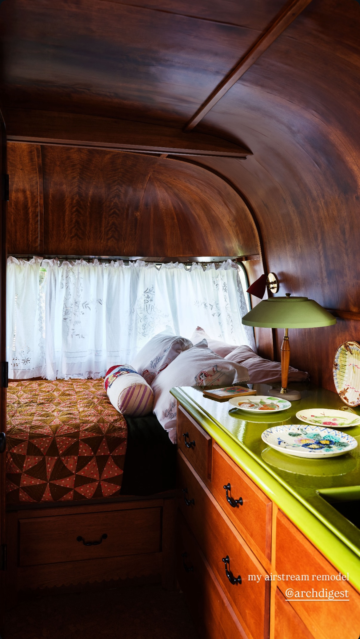 Το πιο πρωτότυπο δωμάτιο, ωστόσο, βρίσκεται εκτός του σπιτιού, μέσα σε ένα Bambi Airstream που έχει πλέον μετατραπεί σε τρίτο ξενώνα. Με φαντασία και προσοχή στη λεπτομέρεια, ανακαινίστηκε ώστε να περιλαμβάνει νερό, ηλεκτρισμό και μπάνιο, δημιουργώντας έναν χώρο που κάνει κάθε επισκέπτη να νιώθει πρωταγωνιστής σε χειμερινή ιστορία. Υφές όπως δαντέλα, ξύλο, βαριές κεντητές κουβέρτες και γήινες αποχρώσεις συνυπάρχουν αρμονικά, συνθέτοντας ένα ιδιαίτερο και φιλόδοξο αισθητικό αποτέλεσμα.