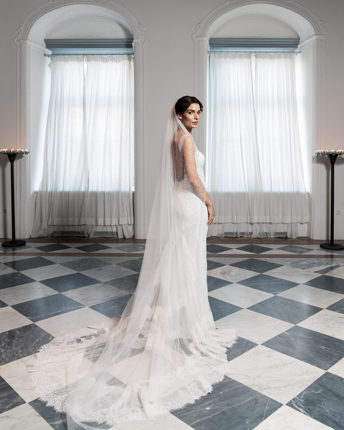 Εσωτερικά το σώμα της αγκάλιαζε απαλά ένα μεταξωτό σατέν, ενώ στο μεταξωτό τούλι που χρησιμοποιήθηκε εξωτερικά ήταν κεντημένα, με την τεχνική του patchwork, 18 είδη ντελικάτης δαντέλας. Το ρομαντικό ύφος της sur mesure δημιουργίας συμπλήρωναν οι πέρλες που είχαν κεντηθεί σε όλο το νυφικό, καθώς και στο μακρύ μεταξωτό πέπλο.