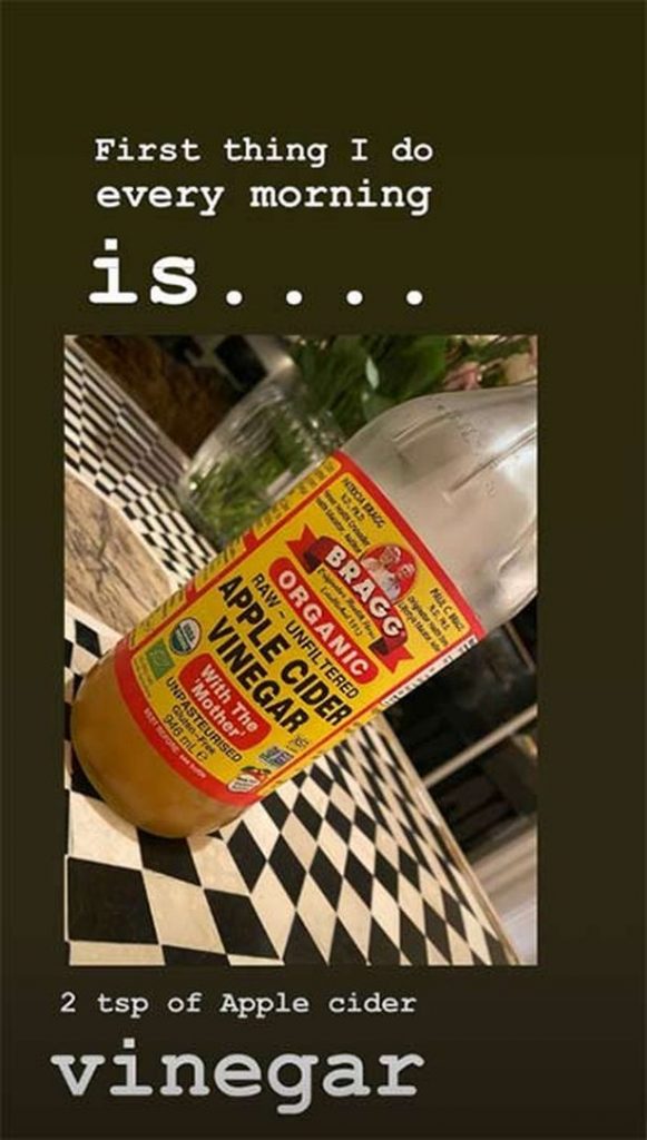 Η πρώτη φωτογραφία που πρόσθεσε στα Instagram stories της περιελάμβανε ένα μπουκάλι βιολογικό μηλόξιδο τοποθετημένο στο τραπέζι της κουζίνας. “Το πρώτο πράγμα που κάνω κάθε πρωί είναι να πίνω 2 κουταλάκια μηλόξιδο” έγραψε. Στη συνέχεια πρόσθεσε “Ακολουθούμενο από … φρέσκο λεμόνι στιμένο μέσα σε βραστό νερό.”