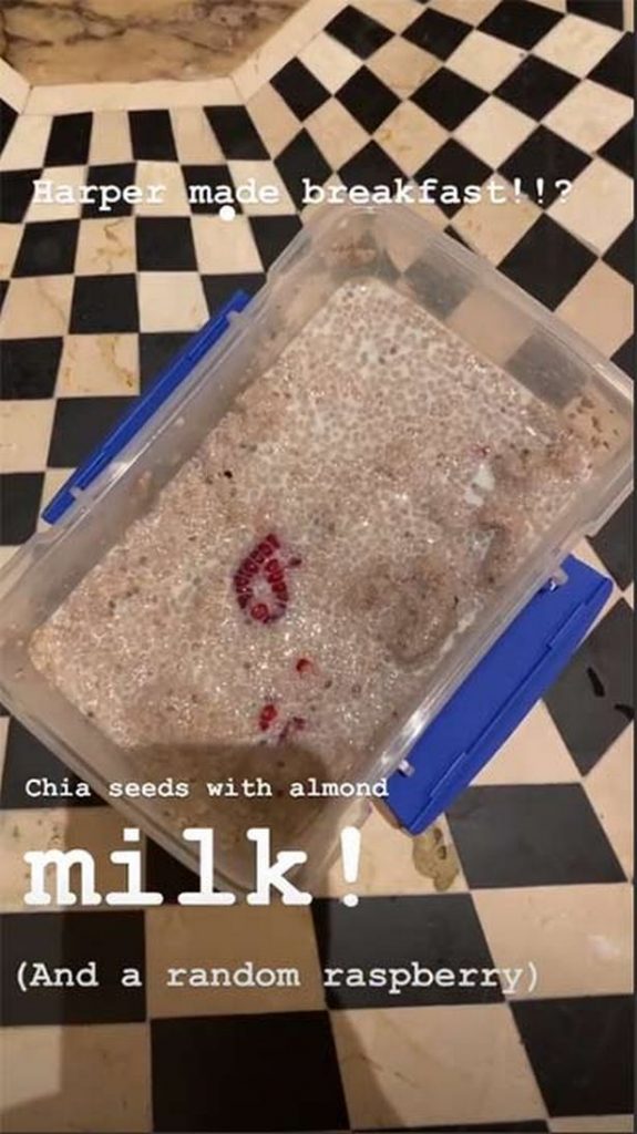 Συνέχισε με μια εικόνα πρωινού από την οκτάχρονη κόρη της, Harper, το οποίο περιελάμβανε σπόρους τσιγιά και γάλα αμυγδάλου το οποίο ολοκληρώθηκε με ένα βατόμουρο ή, όπως το χαρακτήρισε η Victoria ένα “τυχαίο βατόμουρο”.