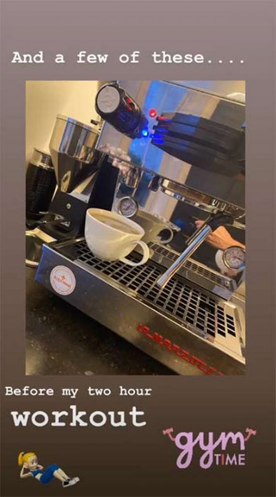 Η πρώην τραγουδίστρια έδειξε στη συνέχεια ότι μετά το πρωινό της ακολουθούν “μερικοί” καφέδες πριν αρχίσει τη δίωρη προπόνησή της.