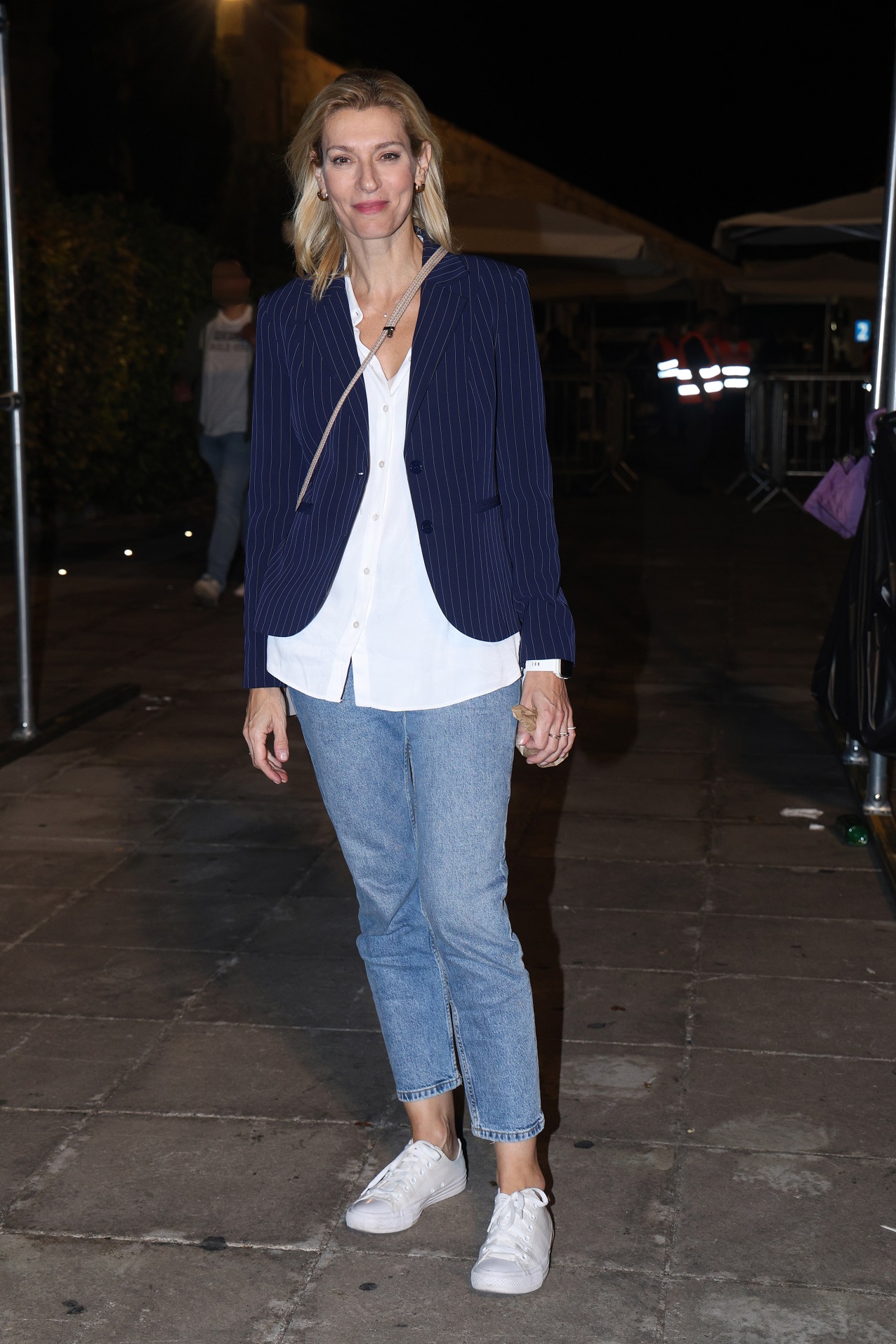 Η Ζέτα Δούκα βρέθηκε στο χώρο της συναυλίας φορώντας ένα άνετο και άκρως κατάλληλο για την περίσταση σύνολο, το οποίο συνέθεταν ένα στενό denim παντελόνι, ένα λευκό, μακρύ πουκάμισο, ένα σκούρο μπλε σακάκι και λευκά, πάνινα sneakers.