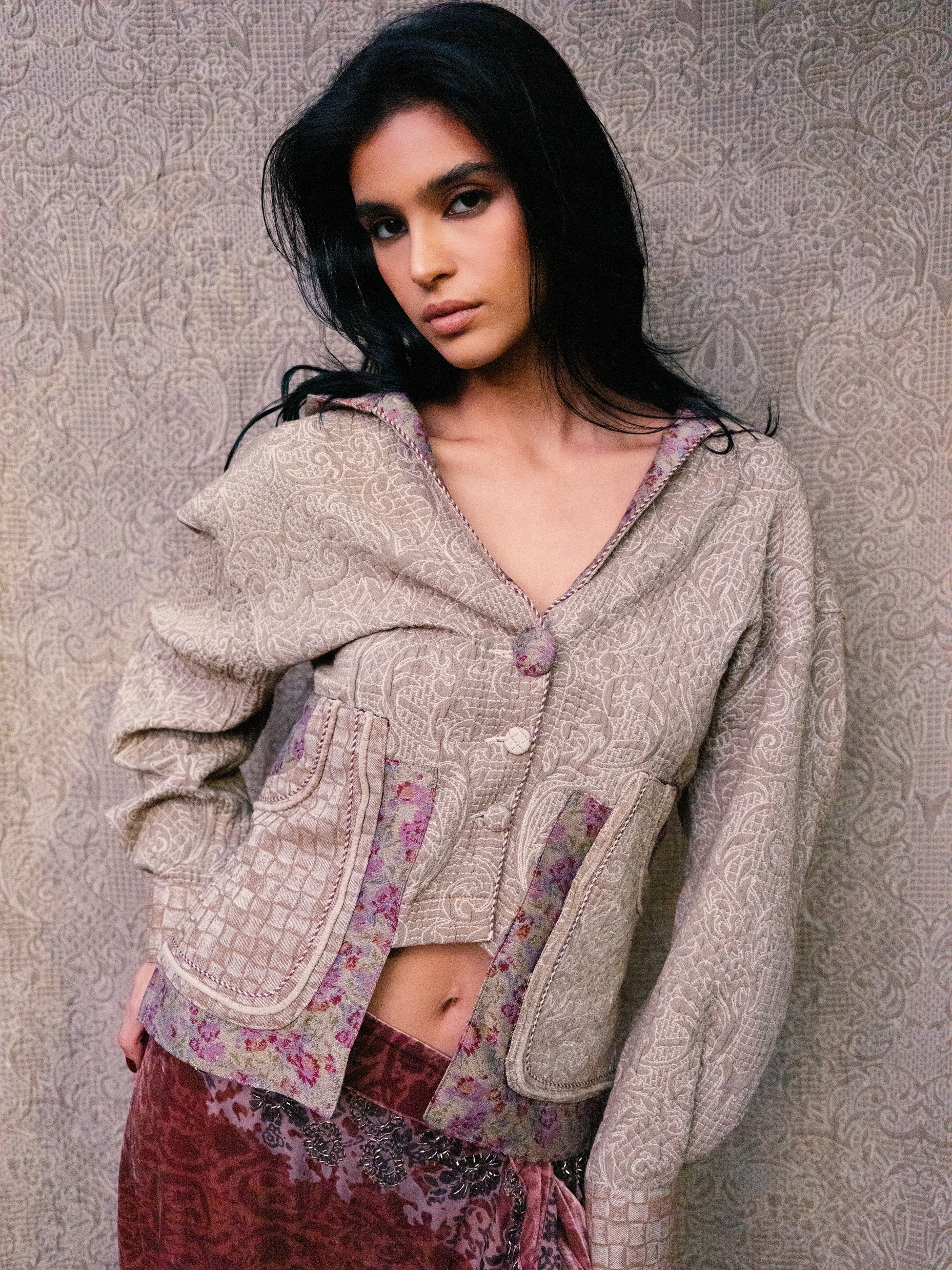 Στο κομμάτι των υλικών, η συλλογή συνδυάζει δέρμα, σουέτ, καπιτονέ βαμβάκι, αλλά και heritage-inspired florals, δημιουργώντας look που δείχνουν ζωντανά και λιγότερο αυστηρά κατασκευασμένα. Όπως περιγράφει η φιλοσοφία της συλλογής, τα ρούχα μοιάζουν περισσότερο σαν να έχουν συγκεντρωθεί, να έχουν αποκτήσει χαρακτήρα μέσα από την ίδια τη διαδικασία και τα υλικά.