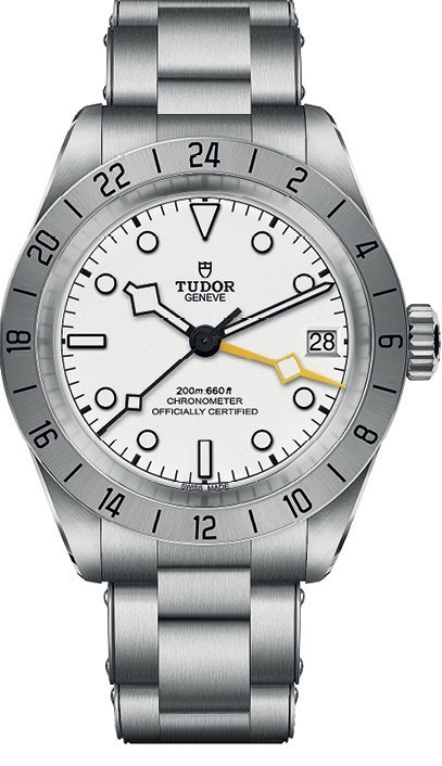 TUDOR BLACK BAY PRO από ατσάλι διαμέτρου 39 mm, στεφάνη με 24ωρη κλίμακα και καντράν από οπαλίνα. Αυτόματο με 70 ώρες αυτονομία και στεγανό στα 200 μέτρα, www.tudorwatch.com.