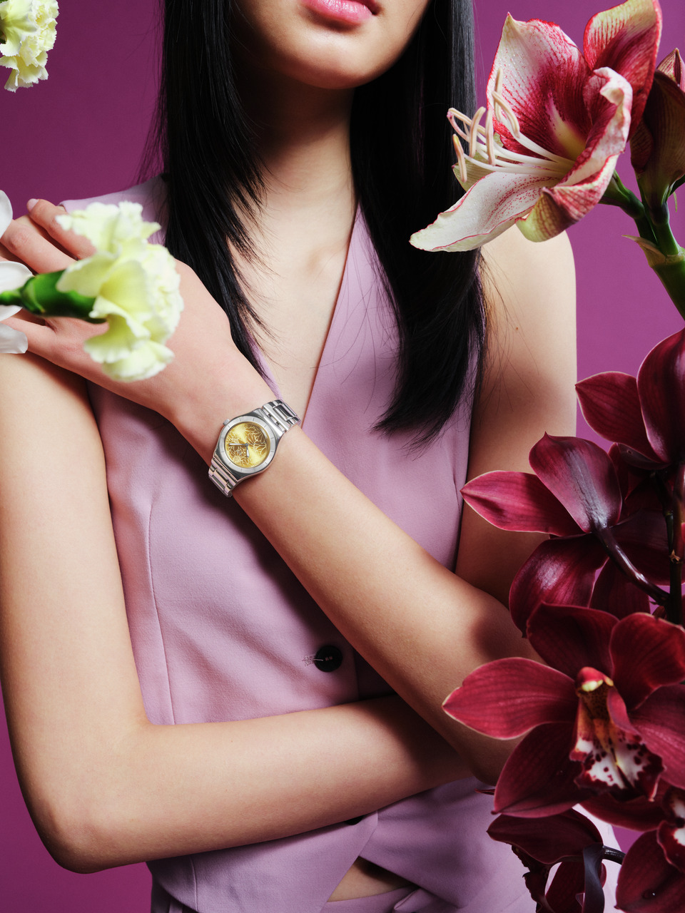 Στο επίκεντρο της συλλογής BLOSSOM TIME, βρίσκονται ρολόγια κατασκευασμένα από ανοξείδωτο ατσάλι με καντράν 33 mm, ιδανικό